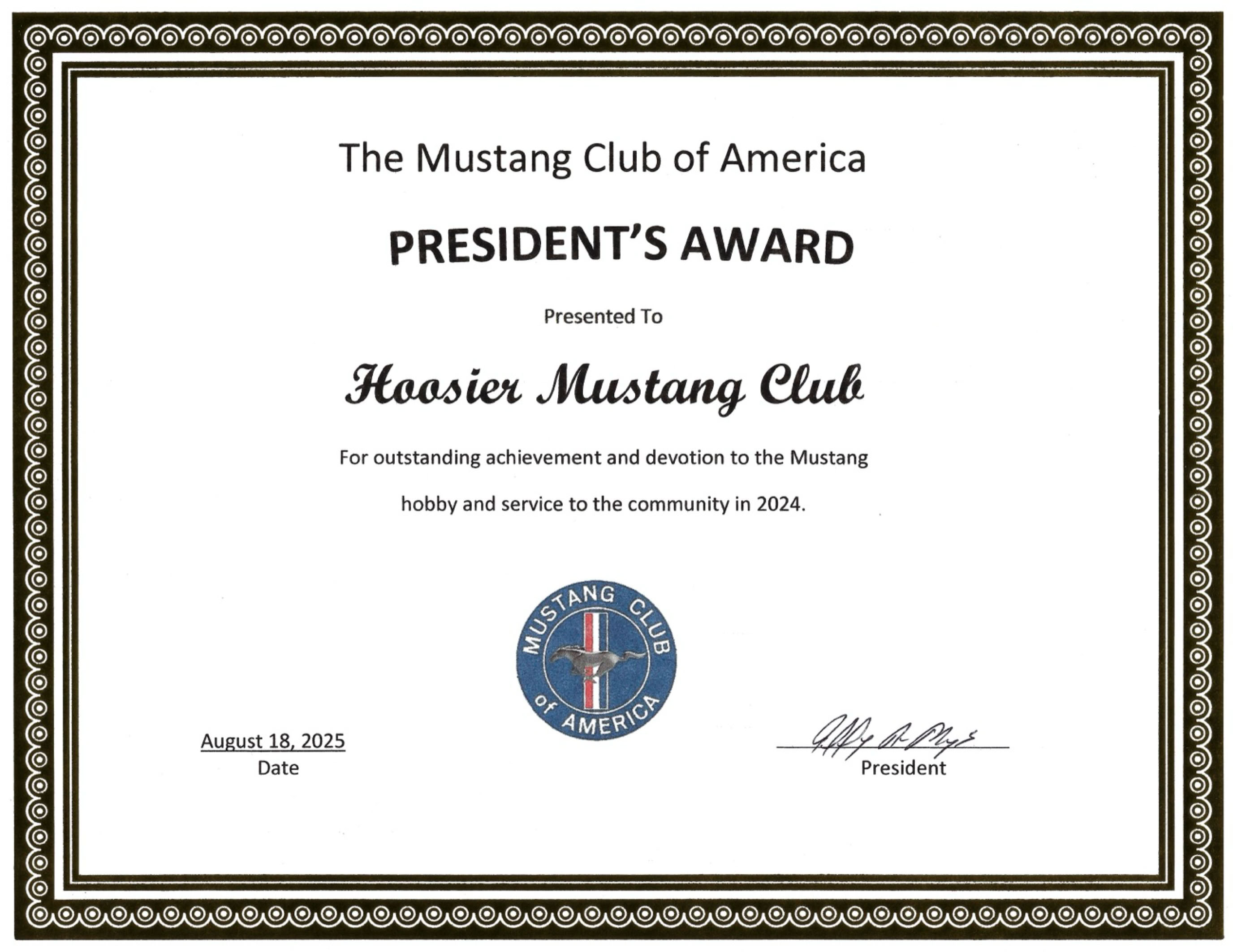 The President of the Mustang Club of America yearly presents his MCA Presidents Award to those regional MCA Clubs who qualify and have 'Shown Outstanding Achievement and Dedication to the Mustang hobby and service to the community'. The Hoosier Mustang Club has qualified for and received this award for 2024.